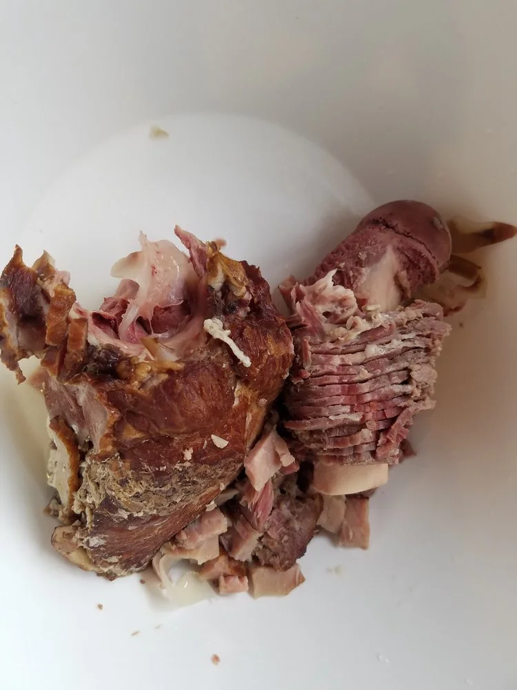 I start with a leftover ham bone, preferably one with some meat still attached. Toss it in your crockpot and add as much water as you can fit. If you’re feeling extremely ambitious, go ahead and toss in some chopped up celery or onion. Or do like I did and just throw the top on. Set it to low and let it cook overnight. Your whole house will smell good while you’re sleeping, and you’ll probably dream of pork chops or bacon